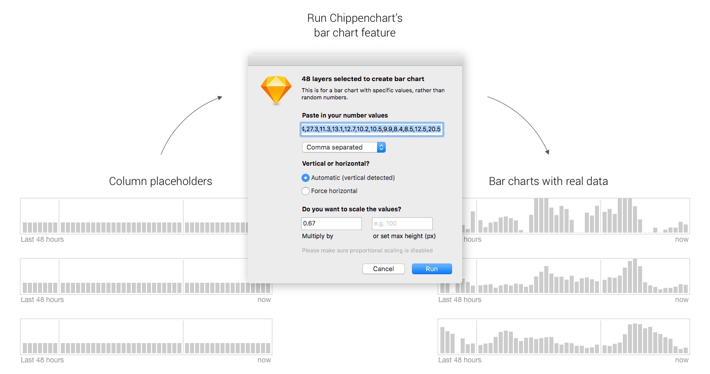 Chippencharts is your friend if you have a bunch of rectangles in Sketch that you want to transform into a bar chart, and you have data available either comma separated, in a row, or a column