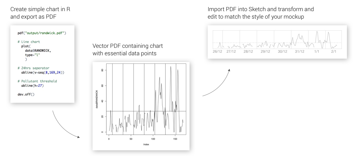 Workflow of using RStudio to create a chart with essential data points, exporting as PDF, and importing to Sketch