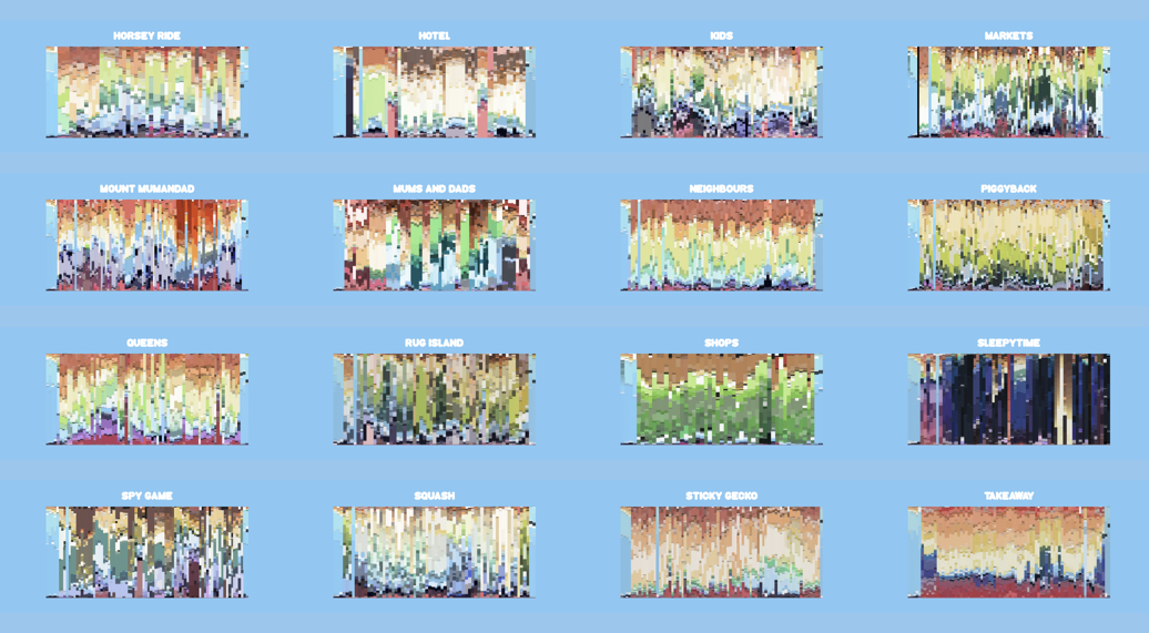 - - The centres of the colour clusters were identified, sorted by hue, and together they become a palette for the frame