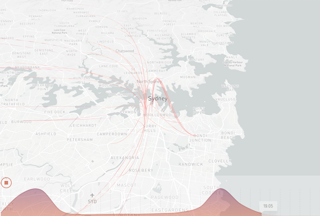 Some visualisations, particularly temporal data or data depicting movement, benefit heavily from animation. We have built a number of custom layers on top of deck.gl to facilitate these challenges.