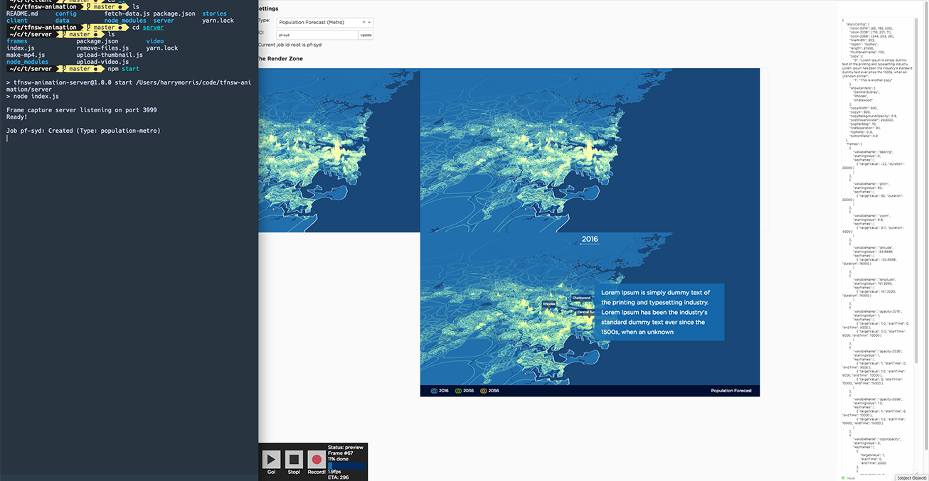 Generating these visuals is another challenge. We’ve come up with two different approaches. The first is to utilise the same web-based technologies, which we’ve integrated into an automated video generation system. This allows us to use the visualisations developed for web, but with more complicated datasets. Additionally, it’s scriptability allows us to generate a unique visualisation for hundreds of datasets. Below is a screenshot of the tool rendering one animation, and below that is the final video.