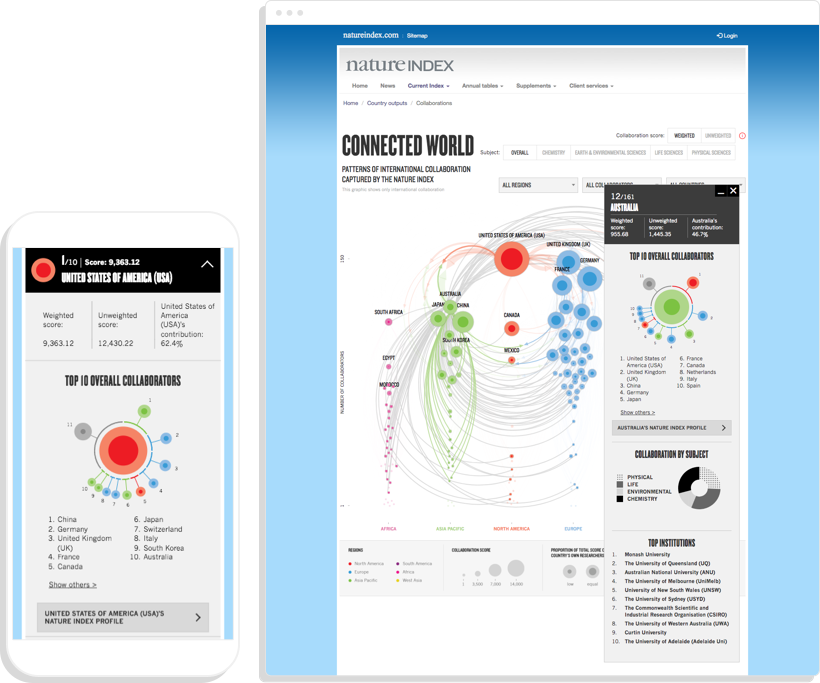 We had the additional challenging of creating the data visualisation available in the print edition of Nature Index one month before the interactive version was launched. This can be viewed in the PDF available at Nature Index Strength In Numbers.