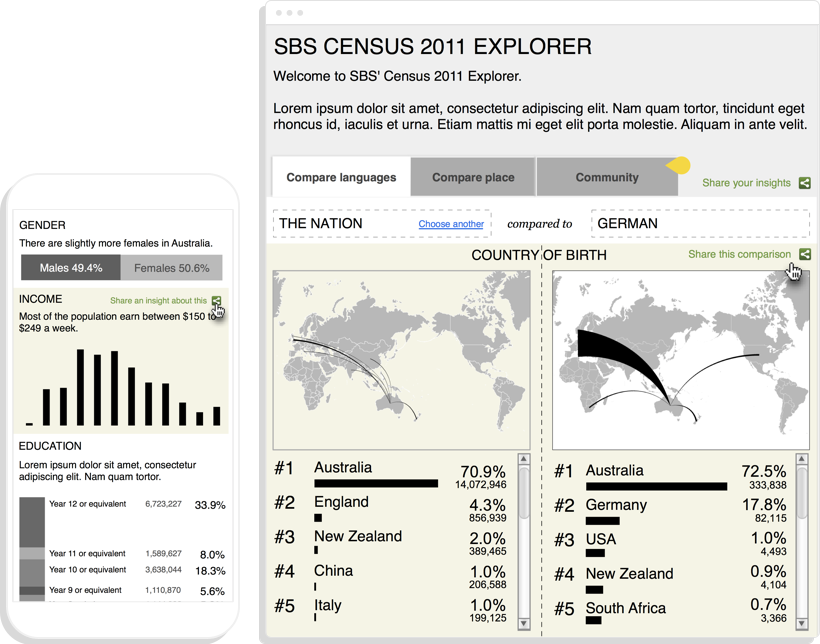This project took the form of a data exploration tool visualising the key demographic indicators. The SBS Census Explorer is an accessible tool for learning more about who we are and where we’re heading as one of the most multicultural countries in the world.