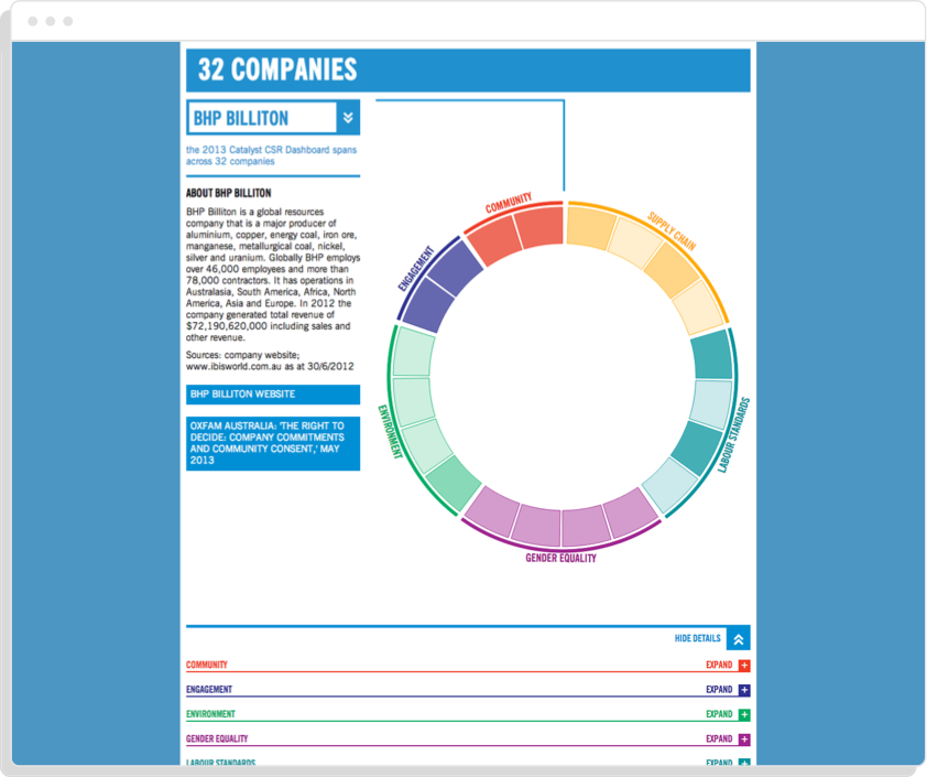 In collaboration with Boccalatte, Small Multiples built the Catalyst CSR Dashboard to help create a better understanding about the impact of corporate power in our society.