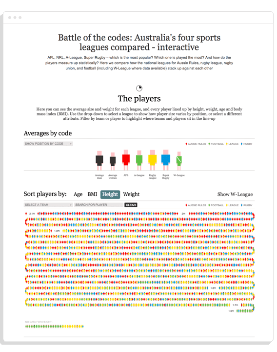 Ranking players from all football codes in Australia by age, height and weight. Using this tool, you can easily visualise the differences in player physical characteristics between NRL and AFL.