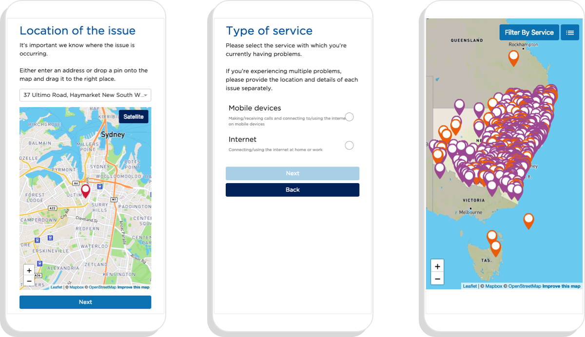 The department needed an interactive map that allowed users to log issues with their internet and mobile connectivity. It needed to be mobile friendly and allow users to see other nearby issues as well.
