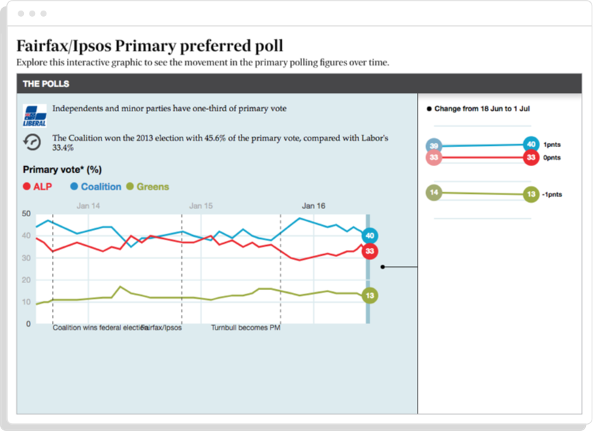 Small Multiples designed and built another key component to the Australian Financial Review’s data.afr.com. The visualisations draw on a database of the latest AFR/Nielsen, Essential, Galaxy, Newspoll, ReachTEL and Roy Morgan national polling data. Audiences are able to discover interesting trends from the data and see how significant national events have influenced public opinion and voting intentions.