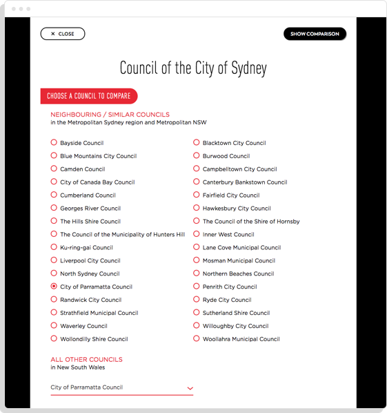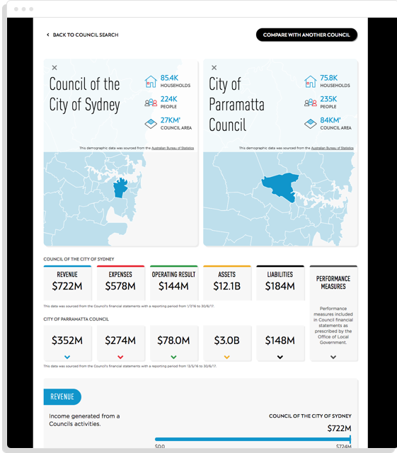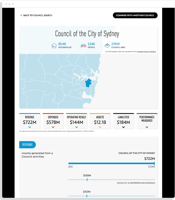 Working with the Audit Office of NSW, we started with a pre-engagement workshop to understand the problem of how to report financials in both interesting and factual ways for councils and the community. A solution was developed, through a process of creating wireframes, designs, and finally implementation.