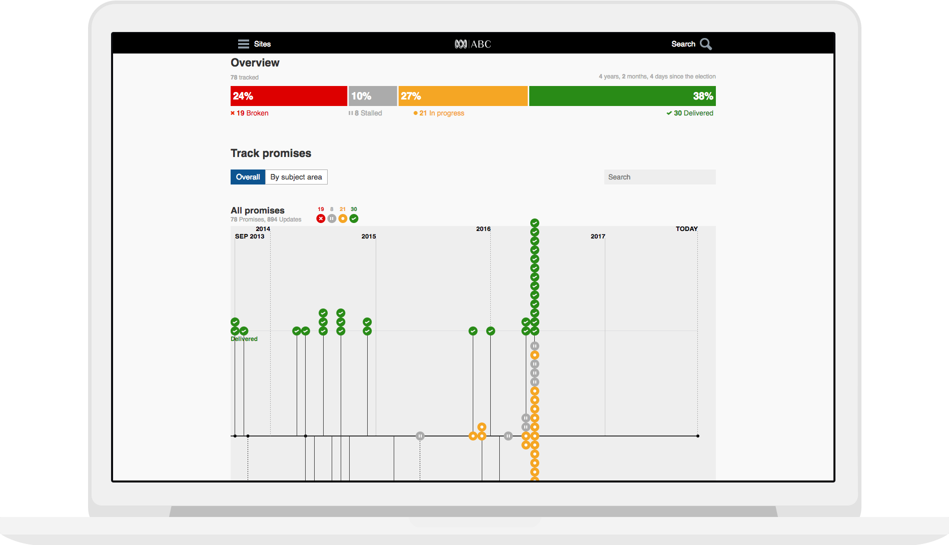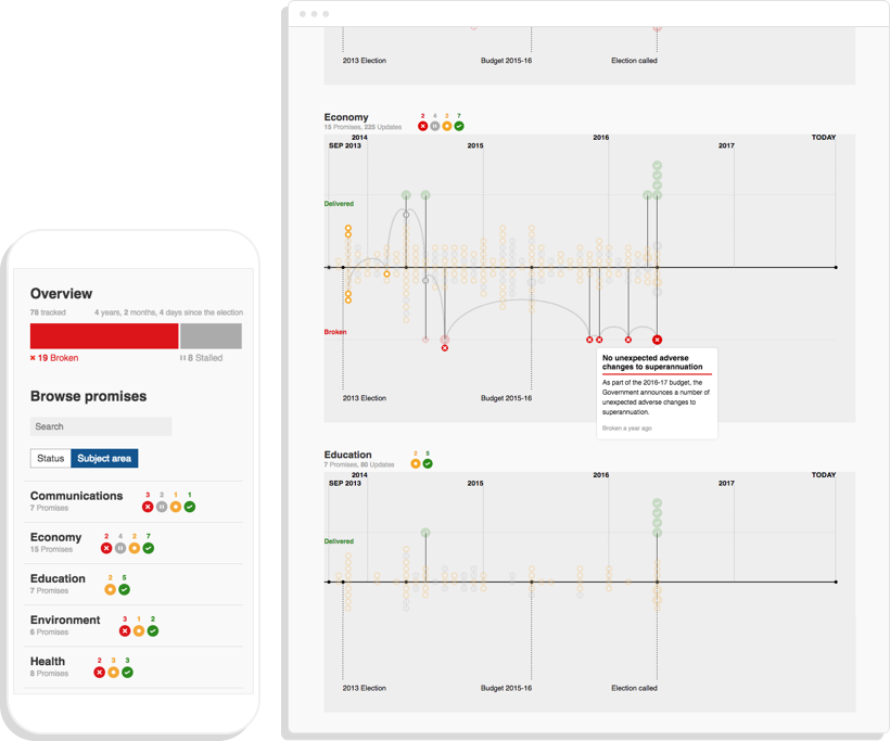 The two major parties made a long list of promises in the lead up to the 2013 Australian federal election. A resource of major promises by the current (2014) Coalition government was missing from the public debate. ABC’s Fact Checking unit commissioned Small Multiples to create a suite of visualisation modules, and the underlying publishing system for making election promises transparent to the Australian public.
