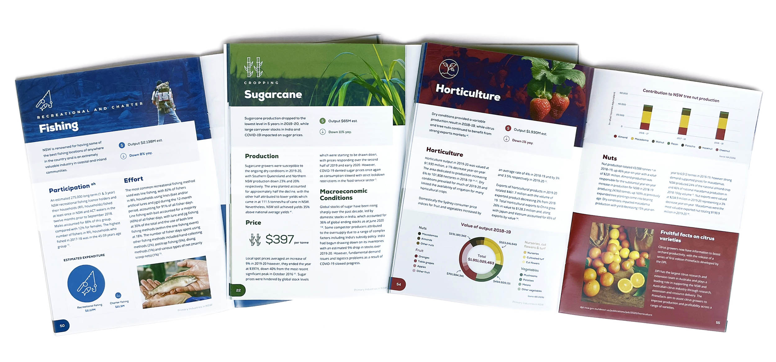 Performance, Data and Insights is a huge report. Over 80 charts document the state of everything from cotton production levels to pork exports and recreational fishing licence sales. There’s over 30,000 words of detailed industry analysis, which need attractive and readable presentation, with unique layouts, images and detailed references.