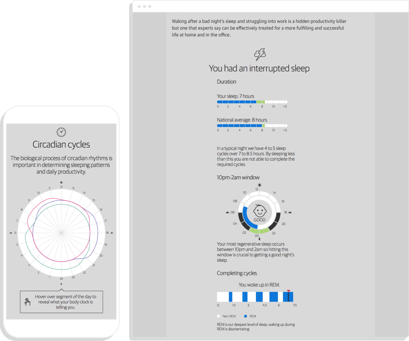We developed a sleep calculator which takes into account the sleeping and waking times to show the amount of hours slept, as well as visualising a personalised REM cycle graph.