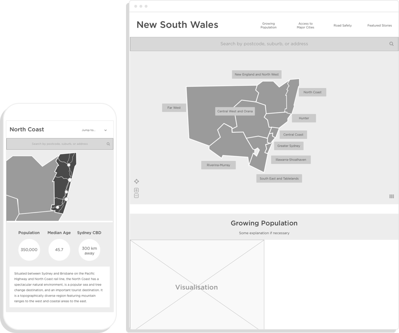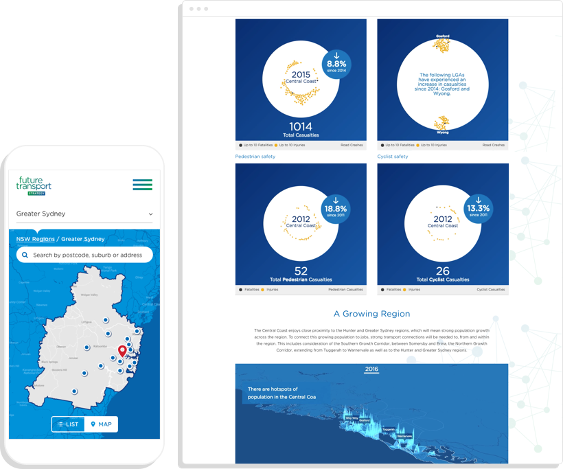 Create an interactive dashboard which visualises the unique Transport challenges that face each region in NSW, to be embedded within the new Future Transport website.