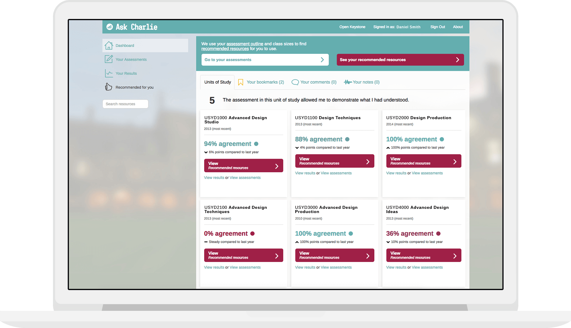 In response to this requirement, we created a platform called ‘Ask Charlie’ that combines student evaluation of teaching results with unit of study information (e.g. class size, discipline, and assessment modes) to display personal recommendations for teaching resources.