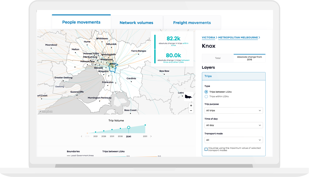 We have been working closely with Transport for Victoria over the past year to create an internal data visualisation portal, helping them to track progress against their strategy and to plan and foresee future growth on all transport networks.